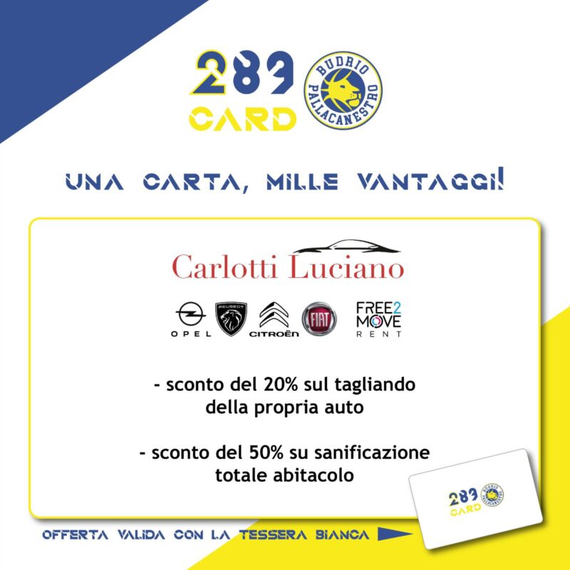 Per i possessori della 289Card BIANCA, il nostro Sponsor Ufficiale Carlotti Luciano ha riservato due imperdibili sconti !!Carlotti Luciano, è rivenditore autorizzato Opel, Citroen, Peugeot e Fiat, oltre a fornire servizio di carrozzeria, officina e restauro di auto storiche ! Da Carlotti Luciano, presentando la tua 289Card, potrai godere del 20% di sconto sul tagliando della…
